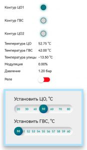 В интерфейсе модуля пользователь может задать требуемую температуру теплоносителя, подаваемого из котла в отопительный контур, которая будет поддерживаться постоянной. Будут отображаться заданная температура, реальная температура и, дополнительно, температура с NTC-датчика, подключенного к клеммам модуля.